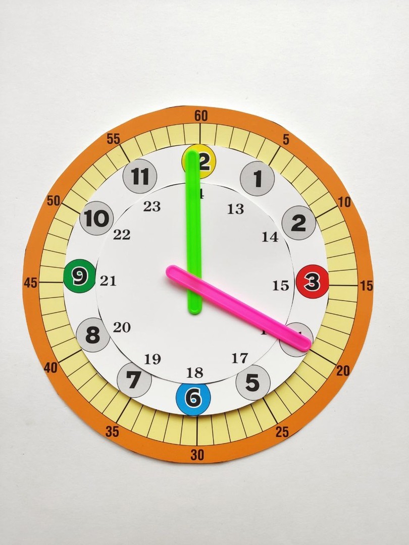 Сначала дети знакомятся со стандартным циферблатом. Главное — запомнить понятия: “маленькая (часовая) стрелка”, “большая (минутная) стрелка”, “движение “по часовой стрелке”. Нужно обратить внимание детей на то, что минутная стрелка вращается чаще, чем часовая. В роли часовой и минутной стрелки могут быть использованы счётные палочки. Нужно лишь заранее условно обозначить, какой цвет палочек для часов и какой для минут.