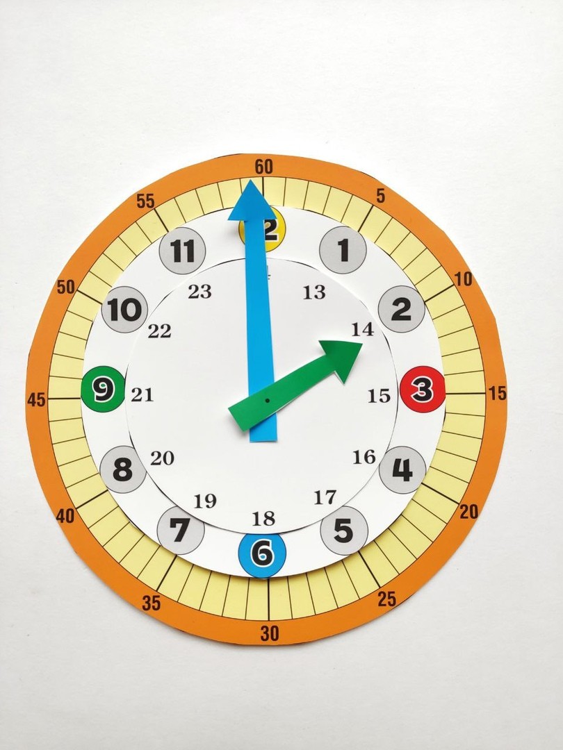 Сначала дети знакомятся со стандартным циферблатом. Главное — запомнить понятия: “маленькая (часовая) стрелка”, “большая (минутная) стрелка”, “движение “по часовой стрелке”. Нужно обратить внимание детей на то, что минутная стрелка вращается чаще, чем часовая. В роли часовой и минутной стрелки могут быть использованы счётные палочки. Нужно лишь заранее условно обозначить, какой цвет палочек для часов и какой для минут.