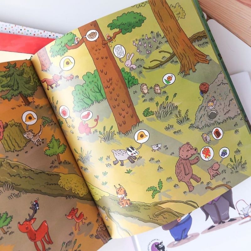 в путешествие по лесу. Хочешь узнать лесные тайны? Открывай книгу и читай её по картинкам! Придумывай свою сказку. Догадайся, о чём думают лесные жители, помоги зайчихе найти и сосчитать зайчат. А в конце ты узнаешь, кто придумал имя Пикотику.
