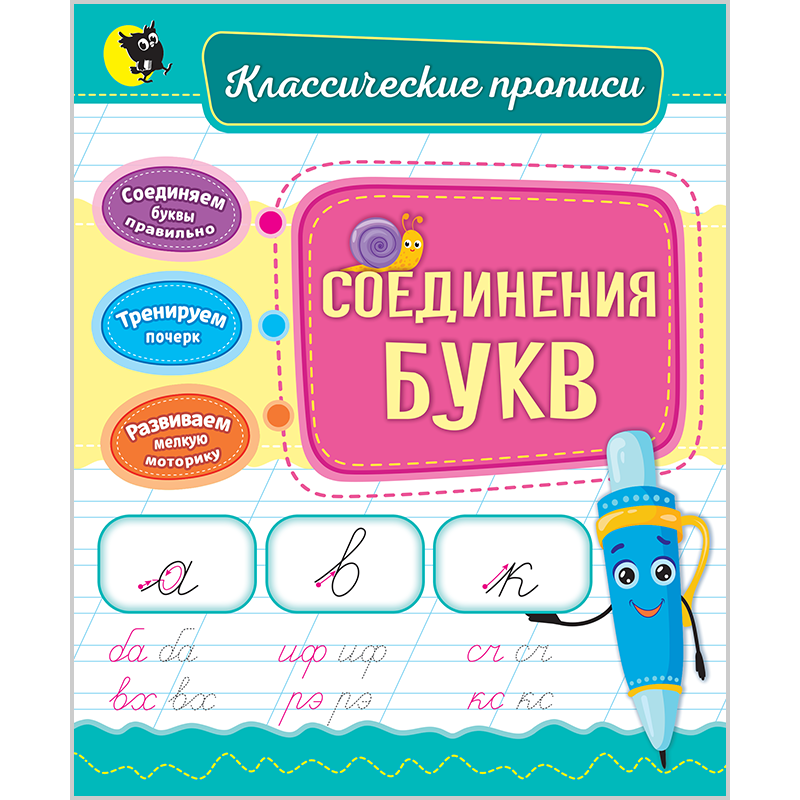 В процессе работы с прописью ребёнок научится отличать различные типы соединения букв: снизу, сверху, посредине. Для отработки каждого соединения предлагаются сочетания букв, часто используемые в русском языке.