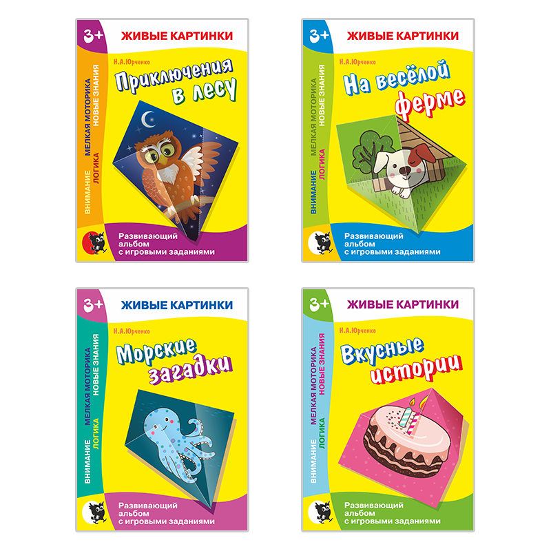 Альбомы с развивающими заданиями помогут вашему малышу научиться складывать бумагу в разных направлениях, выполнять простые надрезы ножницами, проводить линии, рисовать. Задания в «Живых картинках» развивают мелкую моторику рук, воображение, пространственное мышление, учат сравнивать и анализировать, а стихотворения могут сделать этот процесс увлекательным!