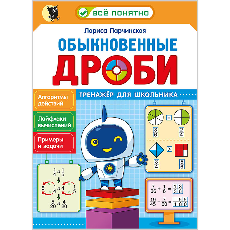 Тетрадь содержит разнообразные упражнения, соответствующие возрасту и школьной программе: от сравнения и арифмитических действий с дробями до решения реальных задач с примерами из жизни. Материал подан в лёгкой форме с головоломками и пошаговыми подсказками. Благодаря постепенному переходу от простого к сложному ученики смогут легко освоить понятия и алгоритмы действий с дробями, почувствовать уверенность в своих силах и полюбить математику.