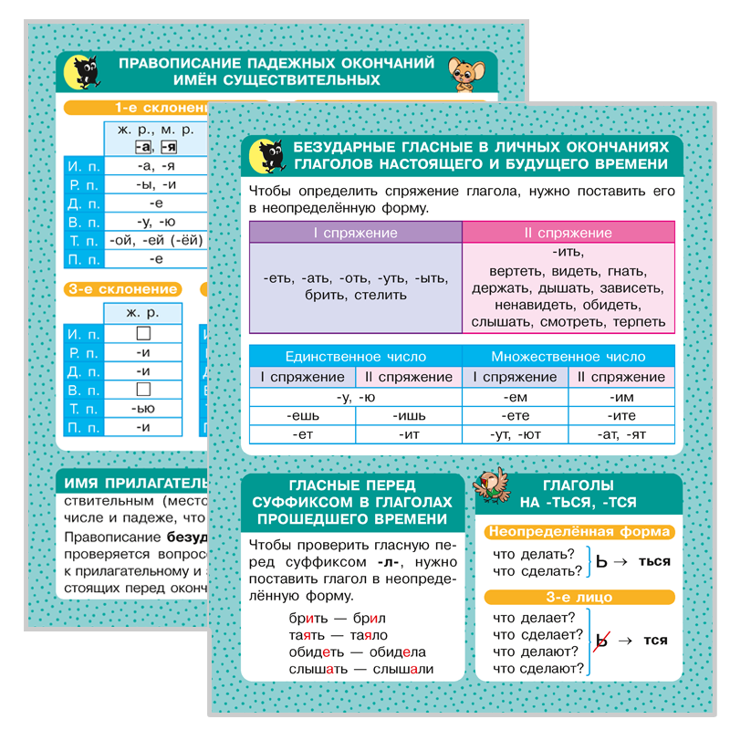 Памятка содержит основные правила русского языка, которые изучают в 3–4 классах, по ключевой теме «Правописание гласных в окончаниях слов». На памятках можно найти: правописание падежных окончаний имён существительных, а также имён прилагательных; помощь в определении спряжений глаголов; правильное написание гласных перед суффиксом в глаголах прошедшего времени; четкие правила написания глаголов на «-ться» и «-тся».