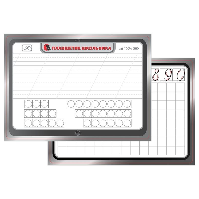 Отличный помощник и для учителя, и для ученика. Многоразовое пособие работает по технологии «Пиши – стирай». Ребёнок получает возможность многократно тренироваться в написании цифр, букв и их сочетаний. Кроме того, предусмотрено написание математических диктантов, решение примеров и задач, контрольное списывание по русскому и белорусскому языкам, составление и разбор звуковых схем слов.