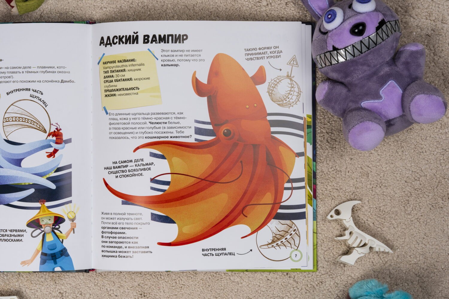 Ты даже можешь подумать, что вид жука-жирафа или краба Хоффа — это причуда природы. Несомненно, тебя удивит уникальная красота рака-богомола, а внешность адского вампира заставит кровь застыть в жилах. Только взгляни на маленького забавного осьминога Дамбо — само очарование, не так ли? Скорее приступай к чтению и приготовься пополнить список своих любимых животных!