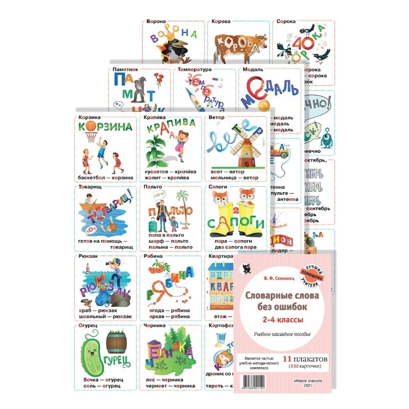 Комплект «Словарные слова без ошибок» состоит из 11 бумажных плакатов формата А2 и методических рекомендаций. В методических рекомендациях описаны основные виды ассоциаций, которые применены к словарным словам 2–4 классов.