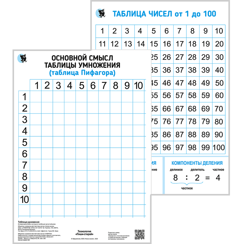 Работа с демонстрационным пособием «Таблица умножения» — эффективный практический способ изучения принципов и примеров табличного умножения и деления. Знакомство с конкретным смыслом действия умножения начинается с изучения и демонстрации таблицы Пифагора. С помощью плаката можно наглядно продемонстрировать переместительное свойство умножения, научить детей находить последовательность и симметрию таблицы умножения.