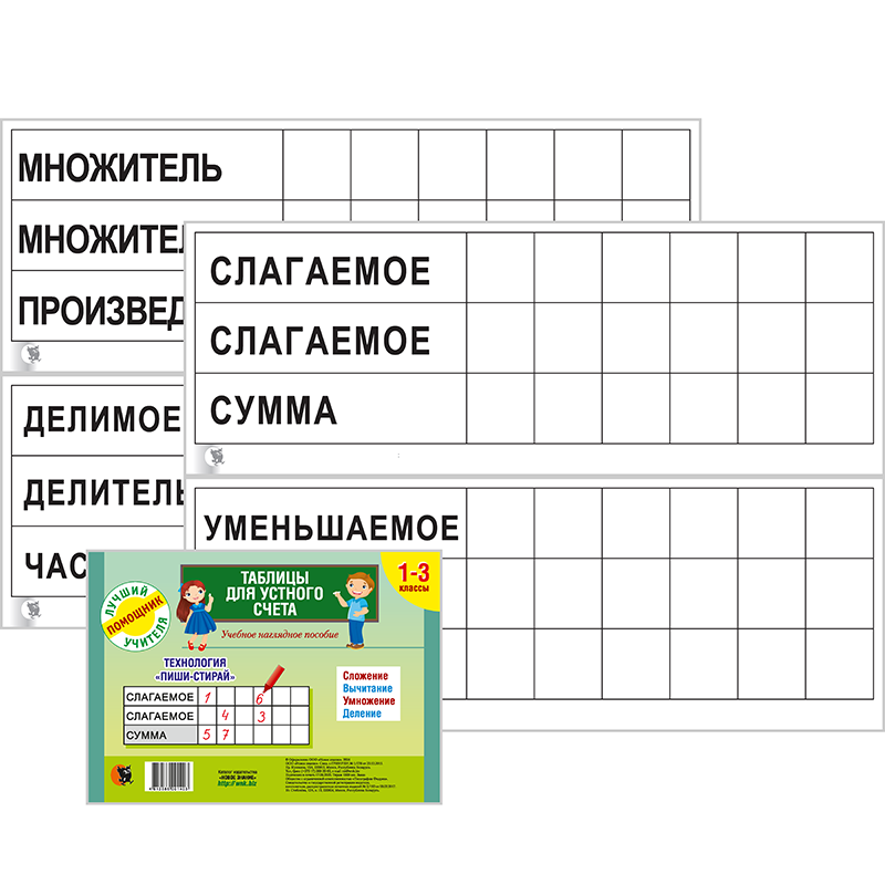 Наглядное пособие включает в себя четыре таблицы для многоразового использования, которые помогут организовать работу по формированию и закреплению навыков сложения, вычитания, умножения и деления.